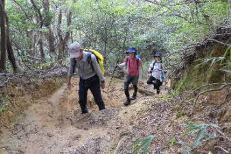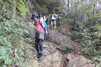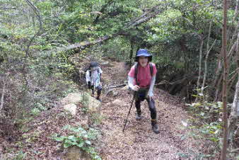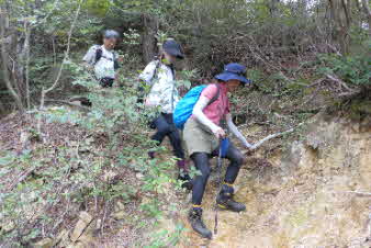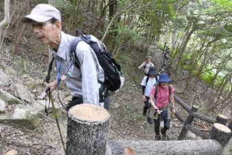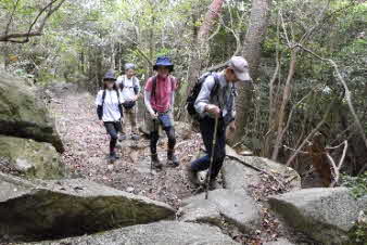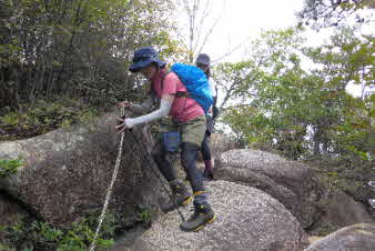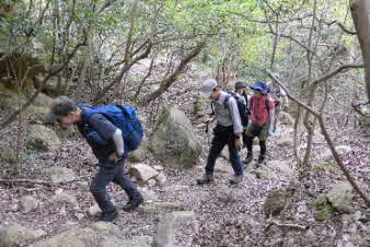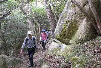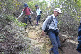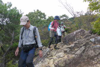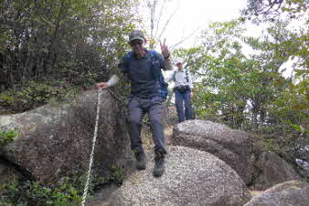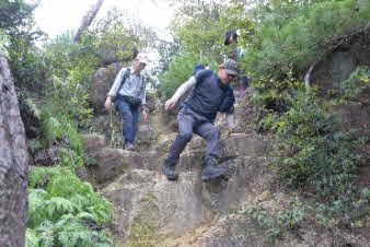 観音山の山頂を後に、鷲林寺へと下山を開始した。少し下ると、急な岩場になってきた。ロープも下がっていて、岩場を楽しんで下った。 |