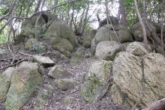 カベノ城をちらっと見たところで、分岐まで引き返し、観音山へと進めた。途中、少し右に分けいると、奇岩があって面白い。大きな大きなソファーのような岩があり、座ってみた。 |