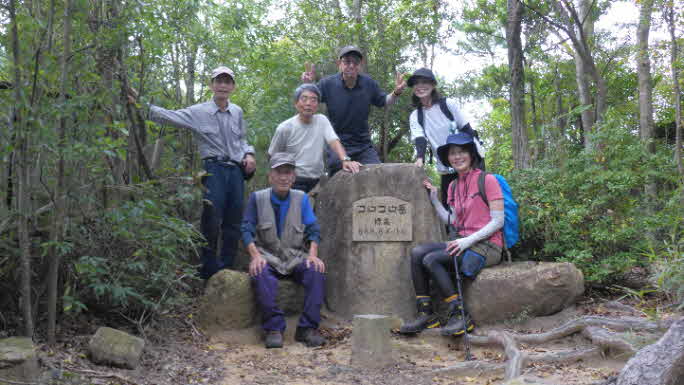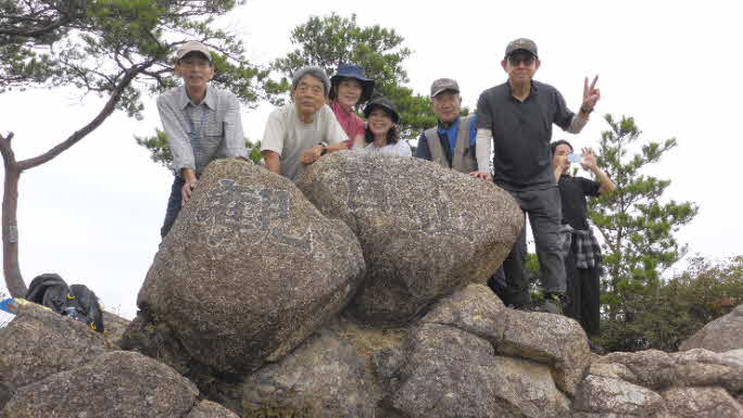 ほんの少し、東へ進むと、一般に知られている、観音山の山頂に着く。山頂には大きな岩が積み重なっていて、岩に「観音山」と記されている。ちなみに、添付の写真のように、2014年友歩会で行った時の写真では「観音山」の文字がきれいだ。素晴らしい展望を楽しみながら、少し遅い昼食にした。 |