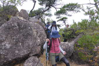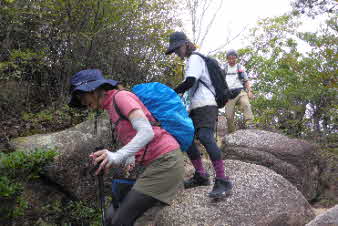 観音山へと、進んでいくと、急な下りがあり、その頭に大きな岩ががる。岩の下りも面白いので、楽しみながら下った。 |