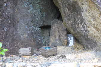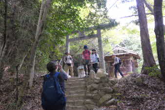 パノラマを楽しんで、鷲林寺へと下っていく。下り始めると大きな岩に囲まれて観音様がお祀りしてある。下りは岩もあり、結構厳しい、注意しながら下っていく。 |