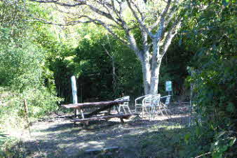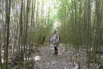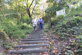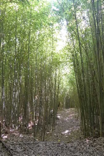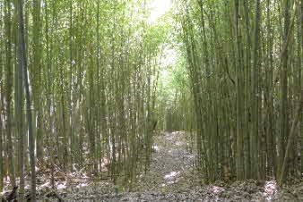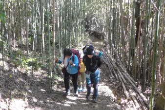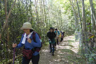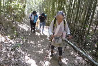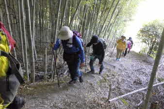 | ティータイムでほっこりして、高坪山から南下した。早速、竹林の中を下った。竹林の竹は、100万本とか、余り手入れはされていたいようで、枯れた竹も少し目立っている。ただ、間引きをしていないのでぎっしり生えたままの竹林だ。 |