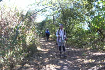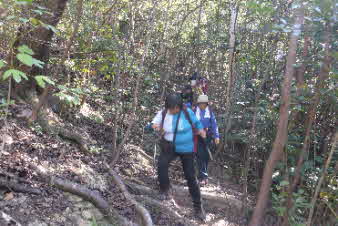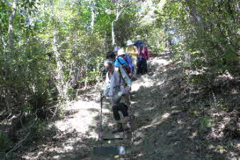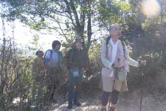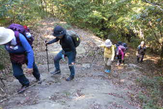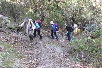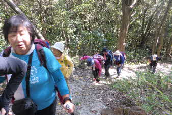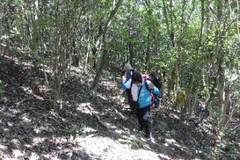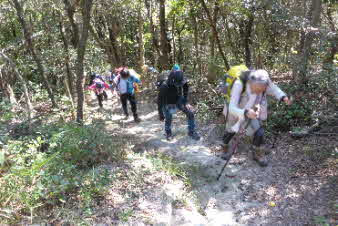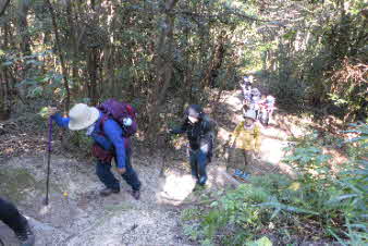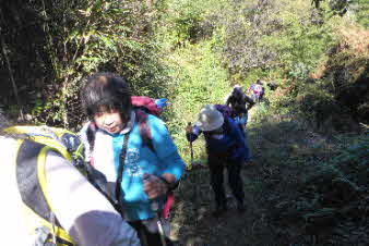 大日山でゆっくりくつろいで、次の山に向かった。いったん鞍部の峠のようなところまで下り、青の山へと登り返していった。結構急な登りだが元気を出して登っていく。