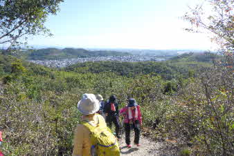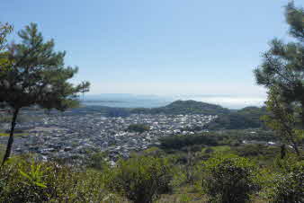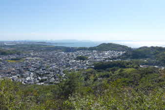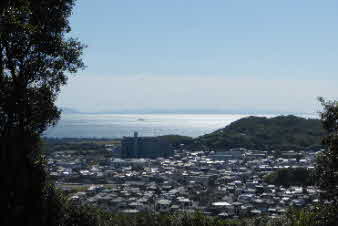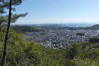 また、木々の合間から北側望むと、先ほど登ってきた、高坪山などが見える。さらに進むと、開けてきて海が見える景色になってくる。