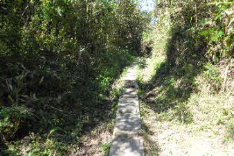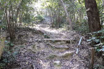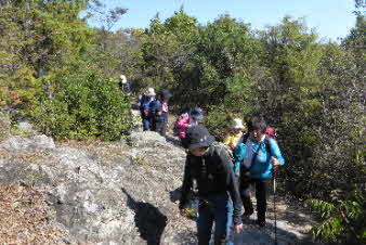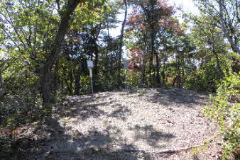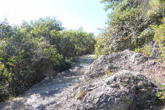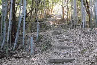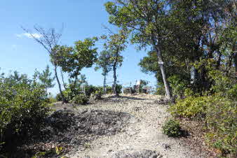 | 登山口を入ると、竹藪の中、急な坂道になる。10分余り坂を登ると、開けてきて岩の尾根になってくる。さらに坂を上っていくと、広い山頂が見えてくる。 |