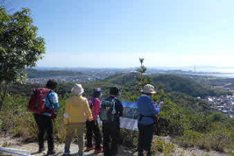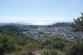 | 坂の山山頂に到着。坂の山は標高111mで的形アルプスの最高峰だ。山頂からは素晴らしい展望で、明石海峡大橋あたりから淡路島、姫路湾、播磨灘方面の大パノラマだ。近くは、的形の街並みの向こうに午後に行く予定の小赤壁のある山々も見える。山頂には、地元の人たちが作ったと思われるベンチなどがおかれている。 |