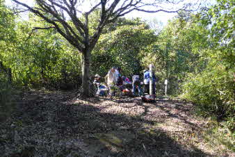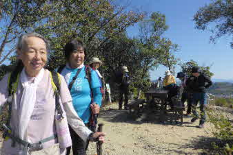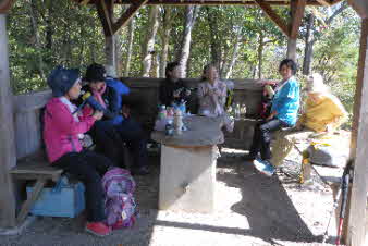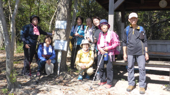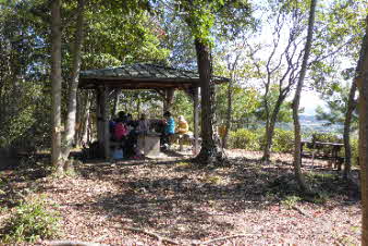 | 大日山は、標高107mで、ベンチはもちろん、東屋も建っている。ここで展望を楽しみながら昼食にした。いつもの山登りと違って今日は、ゆったりした行動で、みんな楽しみながら山歩きをしているようだ。 |