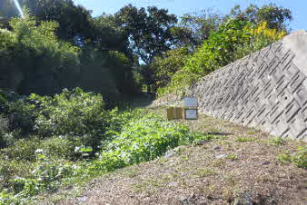 | 下りついた先は、国道250号線だ。横断歩道がないので注意しながら横断する。横断してコンクリートブロックのような壁伝いに進み、山へと登っていく。 |