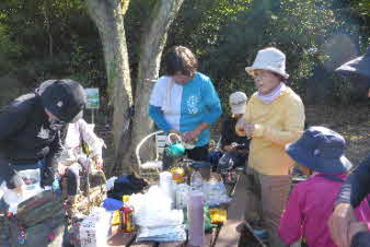 高坪山で皆さんが、手分けして持ってきたお茶やお菓子で、ティータイムになった。テレビの山岳登山番組では、昼ご飯や、休憩時おやつを作って楽しんでいるのがよく見られるが、我々の山登りでは荷物が多くなり、一方時間が足りなくなるのであまりできないのが実情だ。 |