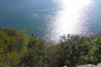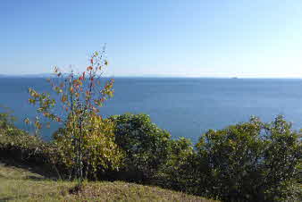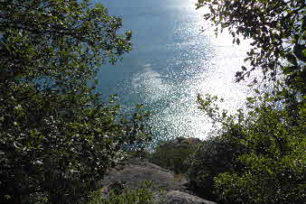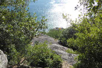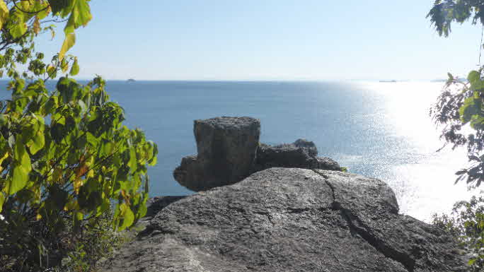 姫御前山辺りまで来ると、木々の間から海が見え始めた。木々の切れ間の岩から下の海を眺めてみたがなかなか美しい。 |