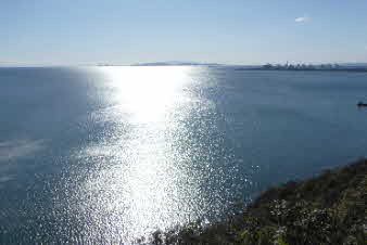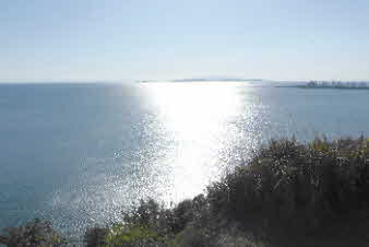 岩と海、小さな公園の緑と海、姫路港、播磨灘が眺められ、太陽も輝いていた。木庭山山頂の小赤壁展望台で展望を楽しむ。 |