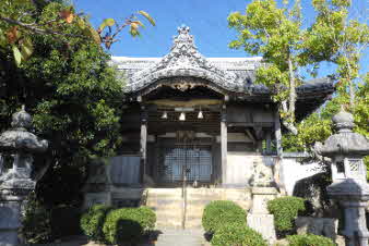 お墓を過ぎ、お寺横を下ると、広い道になり、福泊神社に下ってきた。ここから的形駅へ戻ろうかと思ったが、あと少し我慢して燈籠地山、木庭山へと、住宅横の細い路地を乗った。 |