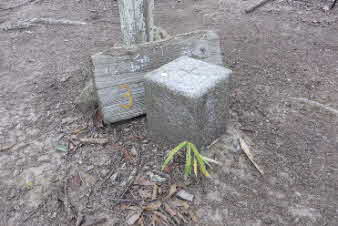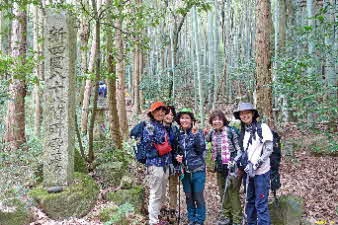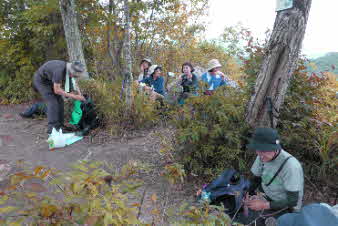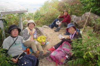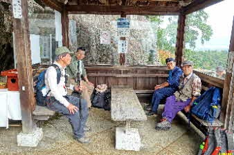 小脇山は、標高373mで、三等三角点になっている。展望もよく、今日最後に登る、太郎坊山も見える。ここで景色を楽しみながら昼食をとった。 |
