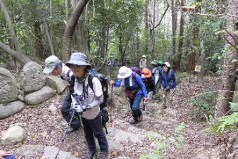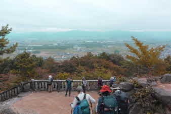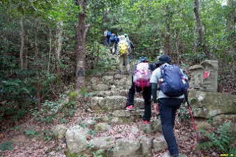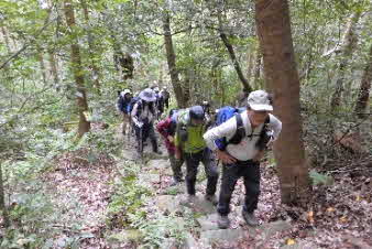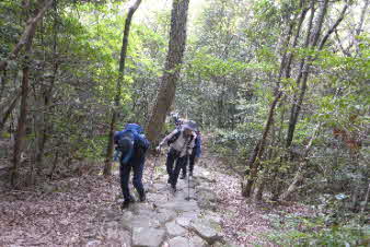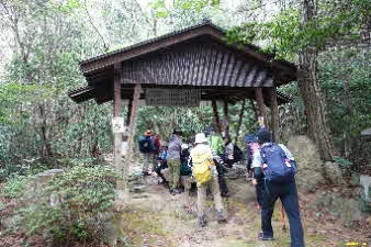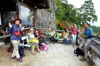 しばらく登って休憩、さらに東屋で休憩、展望台で休憩と休憩を入れながら登っていった。標高差約160m、石段約900段の厳しい登りだった。