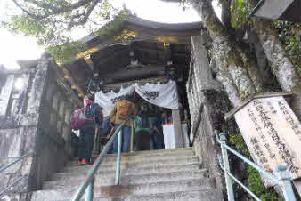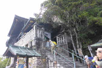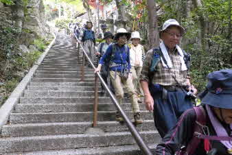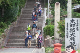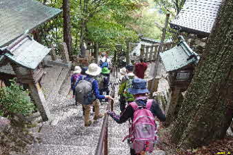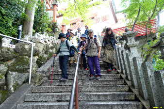 | 太郎坊宮参拝後は、裏参道を下るようにと、知るされていたが、山から下ってきたので、表参道を下った。途中、希望者は御朱印などを頂いていた。長い長い石段を注意して下った。石段は740段あるそうだ。厳しい階段を下り終えると、お参りの実感が湧いてくるようだ。 |