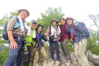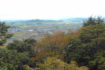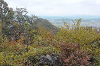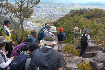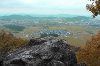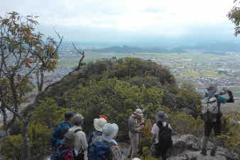 | 小脇山を後に箕作山へと登った。箕作山は標高372mで、岩がゴロゴロしている。山頂から南側下に太郎坊山が見え周りの景色も見える。北側には、比良連山、琵琶湖、竹生島などが見える。景色を楽しんで次へと進む。 |