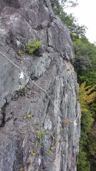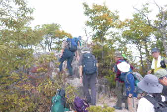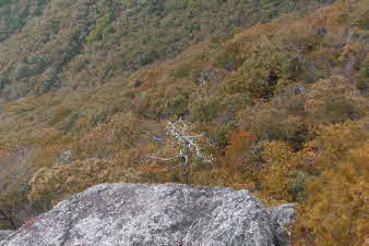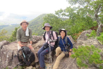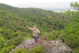 | 絶壁の大岩の左端から、上へ登っていく。一段上に登ると、絶壁の岩の上に出る。ここからの景色も素晴らしい。さらに登ると、岩戸山の山頂に着く。 |