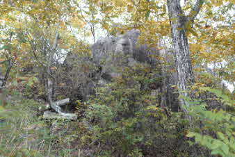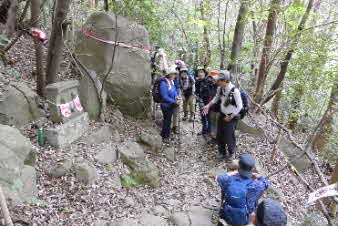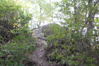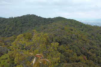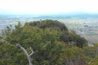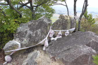 | 分岐まで登り返し、ここから太郎坊山へと下っていく。分岐から登り返すと、太郎坊山山頂に到着だ。太郎坊山は、赤神山とも言われ、標高355mで、山頂は巨岩になっている。360度の展望で、ここまでの通過してきた山、船岡山、岩戸山、小脇山そして箕作山が見える。振り返れば、太郎坊宮の岩の頂も見える。 |