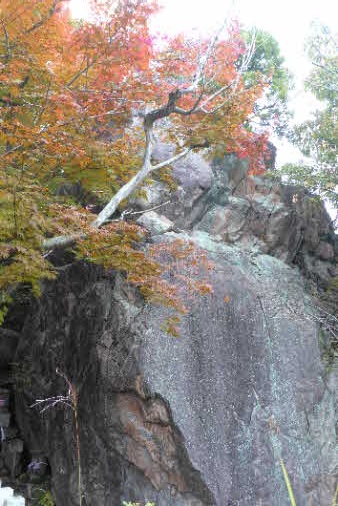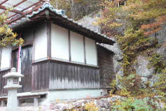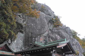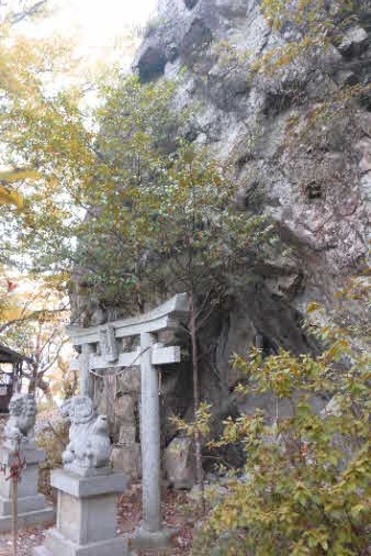 登り詰めると、大きな大きな岩に着く。手前右側の大岩は、岩戸明神が祀られている。左の大きな岩横を登ると、小さな広場になり、お堂が建っている。お堂の後部は、岩戸山と言われる由縁だろうか、天にも届くような大岩の壁になっている。