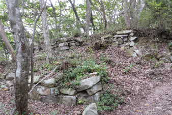 岩戸山に続いて小脇山へと歩き始めた。一旦少し下り、登り返していく。10分ほど進むと、石垣跡があり、小脇城址を通過する。そして少し登ると、小脇山山頂に到着する。