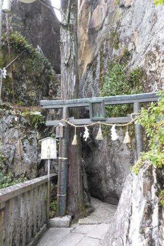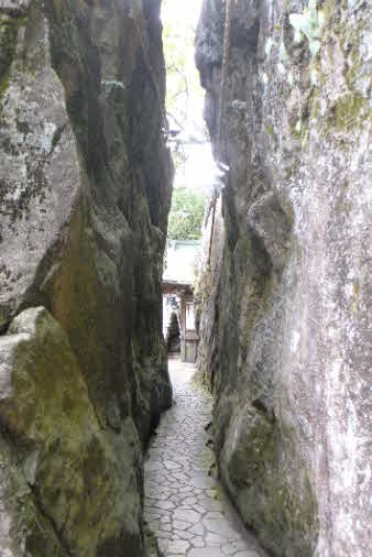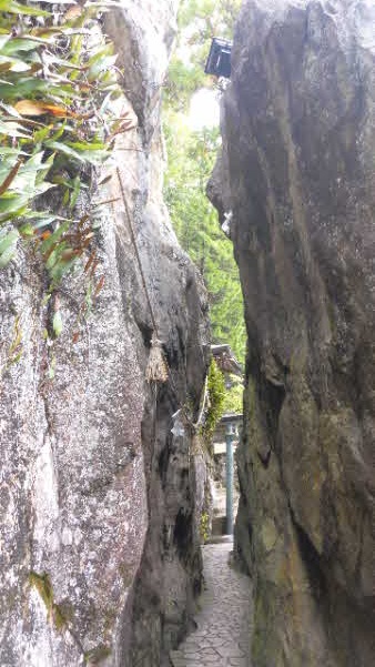 拝殿から少し石段を登ると、夫婦岩になる。夫婦岩は、高さ12m程の巨大な岩が神様の力で、二つに押し開かれたそうだ。岩の間は約80cmほどだ。
