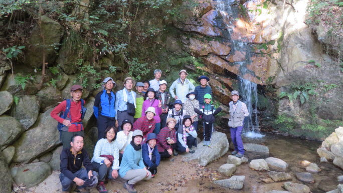 高座ノ滝で身支度をして、休憩。秋なので滝の水量は少し少ないようだ。滝の左上に藤木久三のレリーフがある。藤木久三は、芦屋ロックガーデンの名付親として知られている。