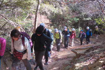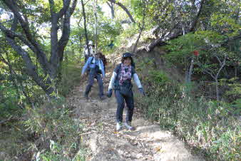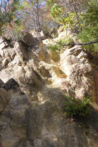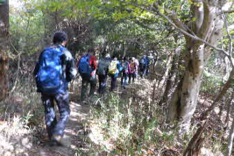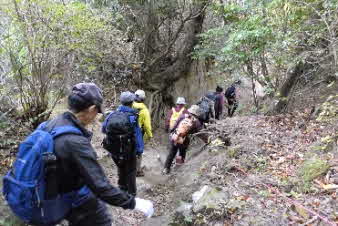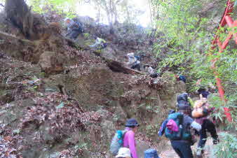 魚屋道について、蛙岩から稲荷神社へ下る魚屋道は、崩壊しているようだ。蛙岩への手前の分岐には、「難路」の表示がされていた。今回、リーダーが下見の時、ひどい目にあったようだ。