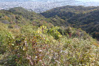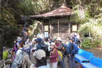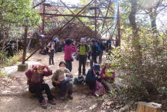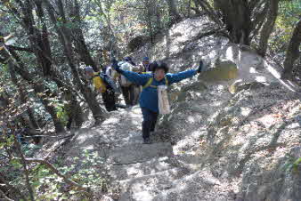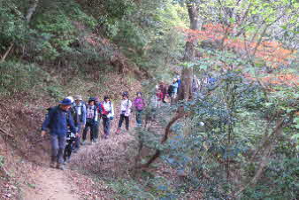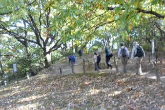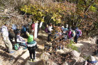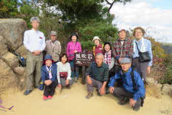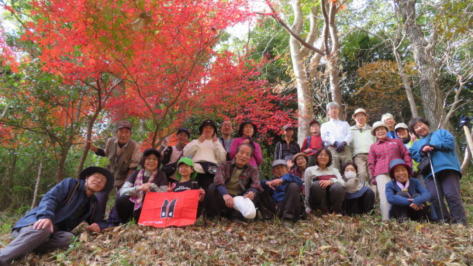 蛙岩の周りの真っ赤な紅葉が美しく、みんなで記念写真を撮った。そして会下山遺跡を通過して登山口へと下った。会下山遺跡には、復元された高床倉庫があるはずだが通り過ごしてしまったようだ。