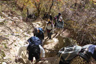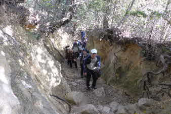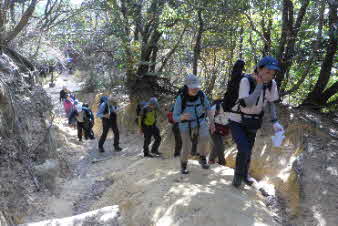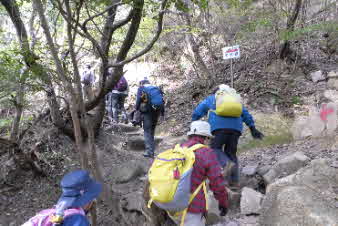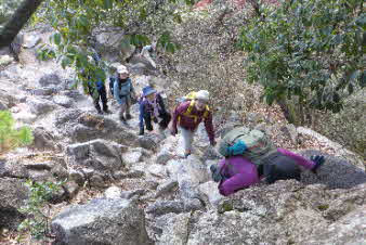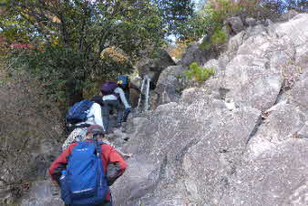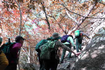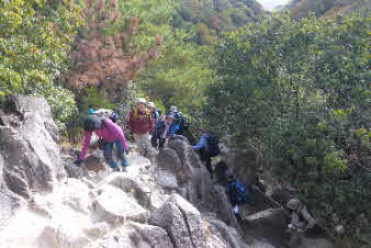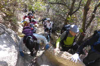 高座ノ滝で全員そろって記念写真を撮り、ロックガーデンへと入っていく。高座ノ滝の右岸の急斜面から登り始める。
