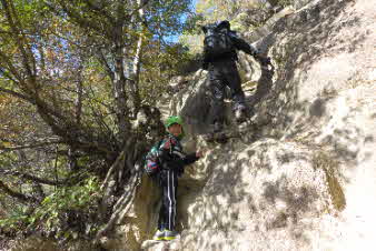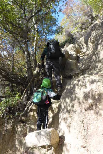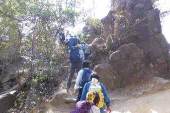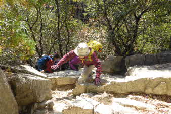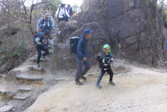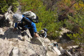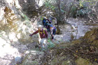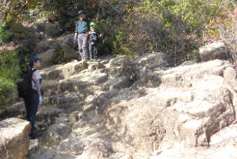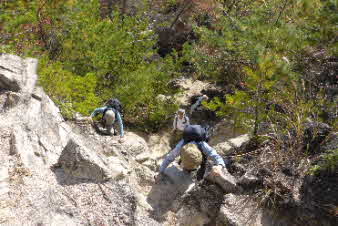 背の数倍以上の岩に取りついて登ったり、自信のない人は、岩を巻いたりしてそれぞれ楽しいクライミングだ。