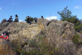 いつも思うのだが、皆のビューポイントである山頂、今日は風吹岩だが、いつも独占している人がいる。みんな独占したいのだから、次の人、次のグループに譲ってほしいものだ。今日もおばちゃん、ポーズをとり続け、長時間独占している。皆が楽しめるよう、マナーを守りましょう。
