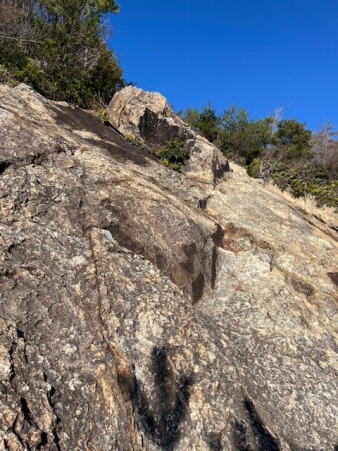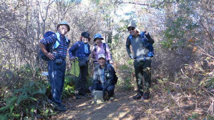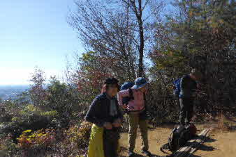 低山ながら所々に、岩の露出した道を登り、高山に登っている感じが得られる。登り切ると、広場になっていて展望台で実質山頂だ。ご近所の毎日登山の方のようで、数人日向ぼっこされていた。