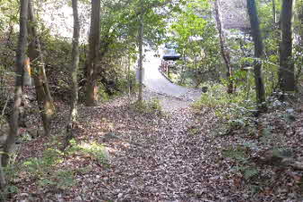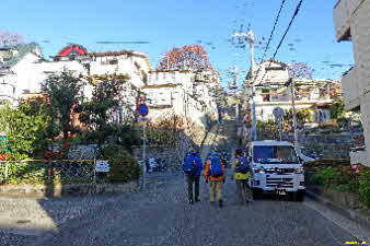 川西能勢口駅を出発、しばらく山に向かって市街地を歩くと、いきなり長い階段道になる。登り切ると、さらにつま先上がりの坂道が続く。日常生活が大変だろうと思いながら登っていく。 |