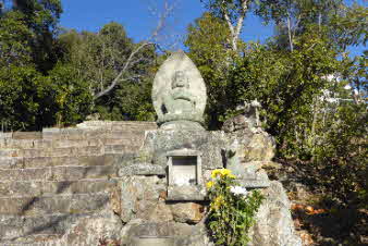 石切山をどんどん下っていく。広場に下ってきた。「ながおだいふれあいこうえん」の標があった。ここから広い道を少し下ると、万願寺への分岐があった。少し下ると、倒木が道を塞いでおり、高巻きして先に進む。この辺りから、四国八十八霊場の石仏が道筋に並んでいた。