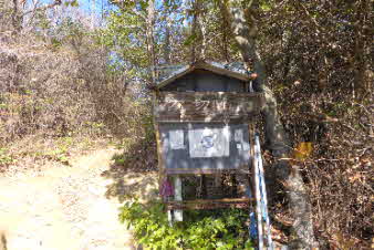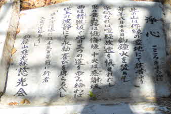 | ほゞ登り終えると、たくさんの石仏が迎えてくれる。浄心の説明版があり、「こころきよやかに」とある。その中に登山道の説明があり、今登ってきた坂が「感謝坂」で、西側に「精進坂」、東側に「懺悔坂」があるそうだ。 |