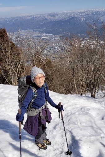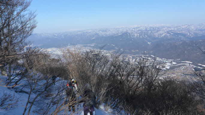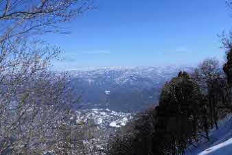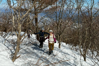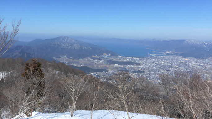 | 一ノ岳付近(行者岩分岐辺り)まで登ってきた。夏山のコースと違って、標識が見えないが、標高690mで展望が良いところだ。やっと急な斜面を登りきった感じだ。木々の間から敦賀市街、白山方面の展望が素晴らしい。 |