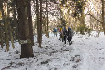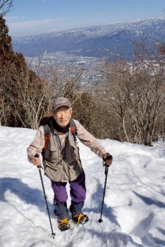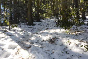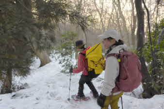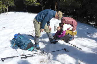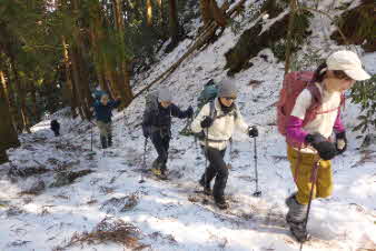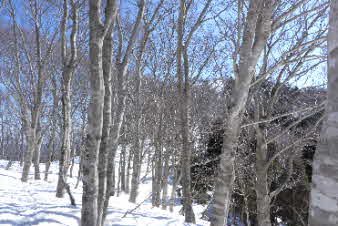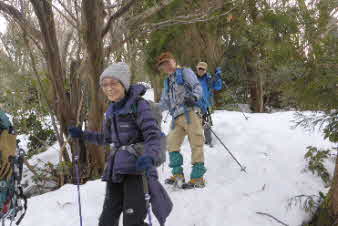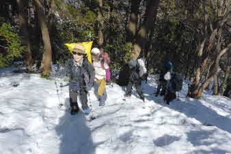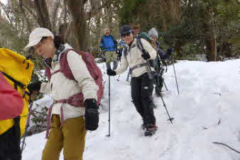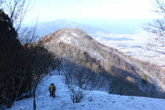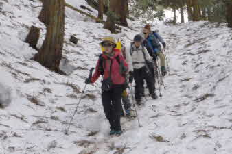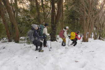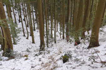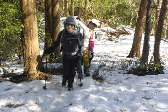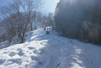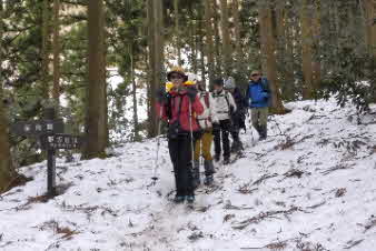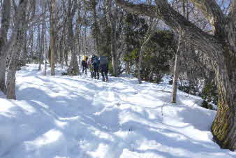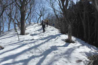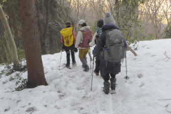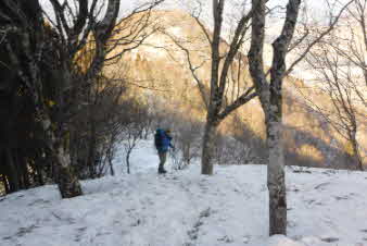 | 登りは、写真を撮る余裕はなかったが、下りは皆さんの雪山の写真も撮れた。 トチノキ地蔵コースの分岐を過ぎると、はぼ樹林帯に入り、白黒の世界に入ってきたようだ。わずかに夕日はさして元気をくれているようだ。 |