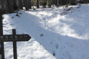 | アイゼンを付けて少し急な斜面を45分ほど登ると尾根に出る。そこからわりと急な尾根を登っていく。ほゞ1時間尾根を登っていくと、道標があり、「山頂へ約1時間30分」が表示されていた。 この道標が、トチノキ地蔵から登ってきた分岐になるのだ。標高は550mほどで、あと標高差360mほどだ。 |
