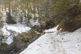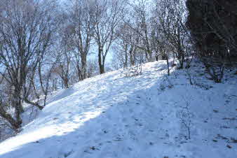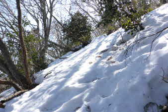 | 分岐から20分余り登ると、沢の少し広いところがあり、ここでアイゼンを装着した。 アイゼン装着して、踏み跡に沿って登っていく。沢の登りがトチノキ地蔵まで続くはずだが、左手の尾根に上がっているようだ。ほかに踏み跡もないのでそのまま前進する。 |
