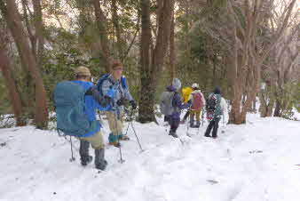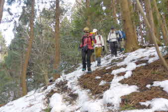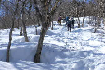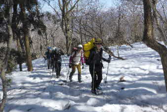 | 急な尾根の登りは延々と続く感じだ。メンバーは若いのでどんどん上がっていくが、かなり厳しい。今回お願いしたリーダーは早く小屋に着いてぜんざいを作りたいのだろう。それは良いのだが、身体がついてこない。必死のパッチだ。 |