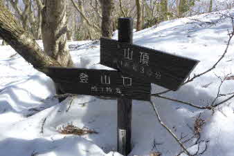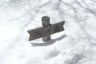 | 三ノ岳を通過、標識は首まで雪に埋まっていた。積雪は1mぐらいはありそうだ。前に見える、山頂を目指して最後の頑張りだ。 |