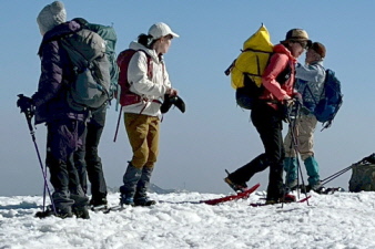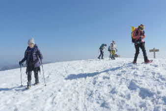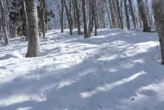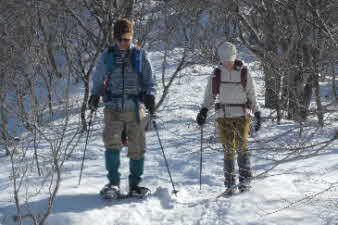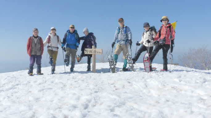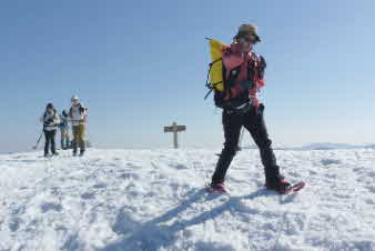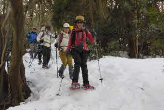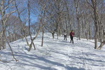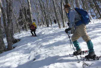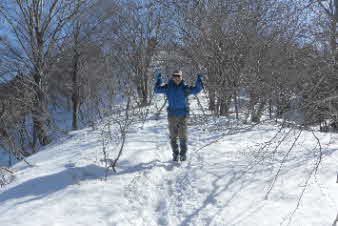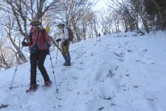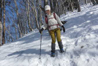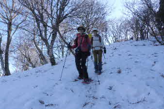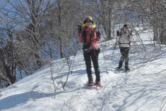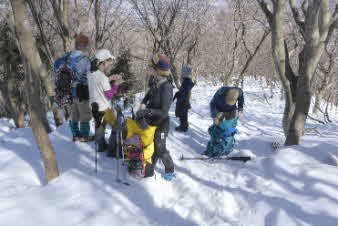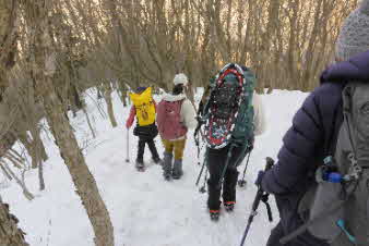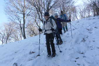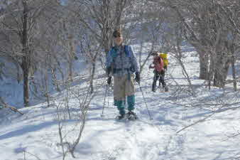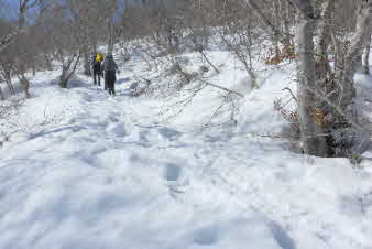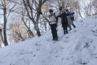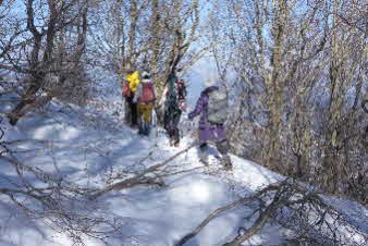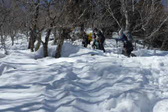 | 野坂岳山頂で素晴らしい景色を堪能して、下山を始めた。必死で登ってきた急な斜面は、今度は楽しい下りだ。 数人、スノーシューを持ってきていたので、スノーシューを付けての下山だ。みんな楽しく、チョットビビりながら雪と戯れていた。 |