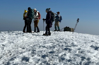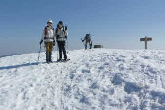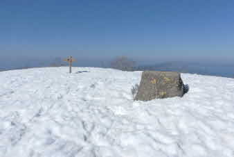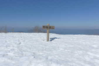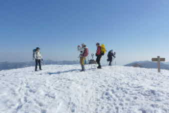 | 野坂岳山頂に全員集合。真っ白な山頂は、素晴らしい。野坂岳は、標高913mで、一等三角点になっている。 山頂からは、360度の大パノラマで、素晴らしい。若狭湾方面、敦賀半島の西方ヶ岳、敦賀湾、敦賀市街、白山とその方面の山並み、琵琶湖東側の山々、特に伊吹山が遠くに美しく見えた。 |