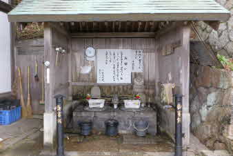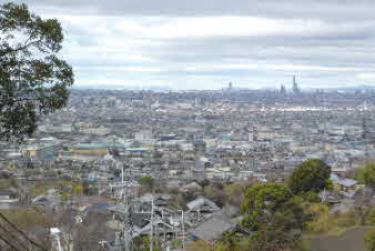 | お地蔵さんにあと押しされて少し急な坂道を上がってきた。水飲地蔵院に到着、水飲地蔵菩薩にお参りした。 右隣に「弘法の水」と呼ばれる清水が湧き出ていて大変有名だそうだ。弘法大師が十三峠をを越える旅人のために祈願して湧き出た水だそうだ。 地蔵院の前から大阪市街の展望が素晴らしい。曇空で少し残念だがそれでも素晴らしい。 |