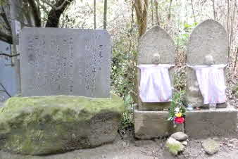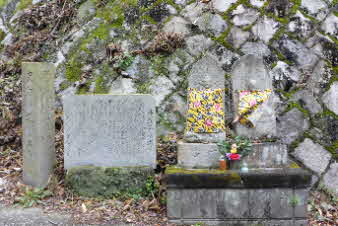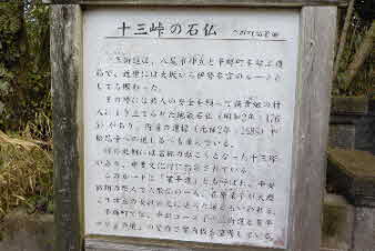 | 十三塚から降りると、十三峠だ。奈良県と大阪府の堺にあって、標高431mだ。 ここに、明治2年につくられた、「十三峠の石仏」がある。天理教教祖中山みきが、末娘の峠越えを祈ってつくられたとか。 |