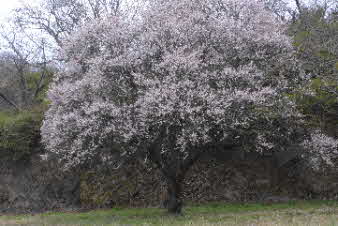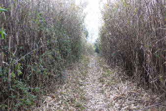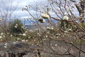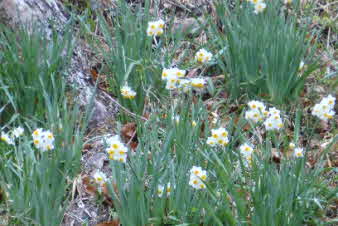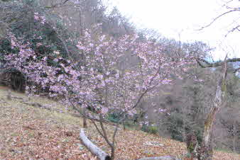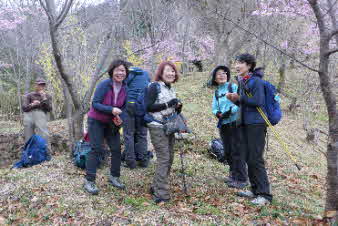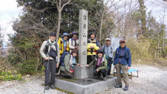 | 簡易舗装の急坂なのでかなり厳しいが、我慢して5分頑張る。山頂近くの城跡になり、ミツマタのお花が迎えてくれた。 |
