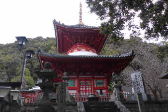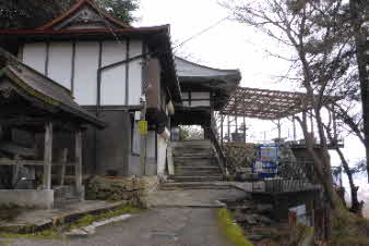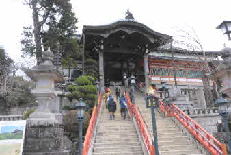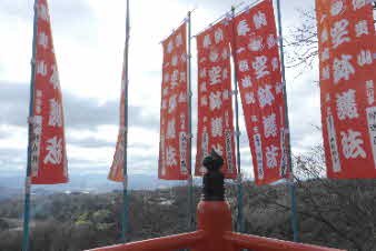 | 赤い鳥居の並ぶ参道を登りきると信貴山山頂で13時55分登頂。信貴山は、標高437mで、空鉢護法堂がある。 空鉢護法堂は、一願成就の守護神として信仰されている。お堂の前の舞台からは素晴らしい展望が待っている。 奈良盆地、二上山、葛城山そして金剛山などが望める。右下に三角錐の山が見え、信貴山の雌岳だ。 |