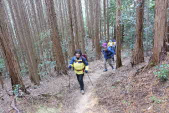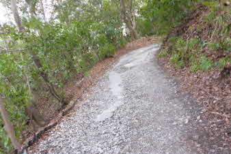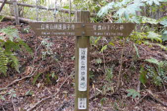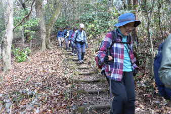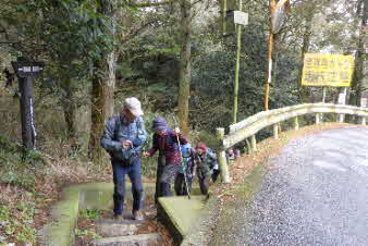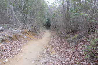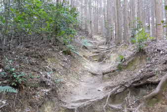 | ハイキング道はよく整備されていて歩きやすく快適だ。信貴山へ登り返す鞍部に25分ほどで下った。 ここから信貴山への登り返しだ。木の根道の急坂などかなり厳しいが、20分ほどで登りきり、簡易舗装の業務道路に出た。 |