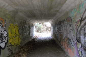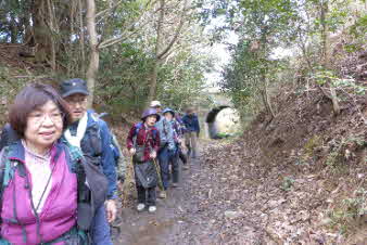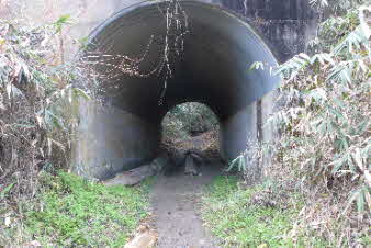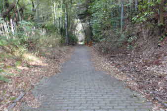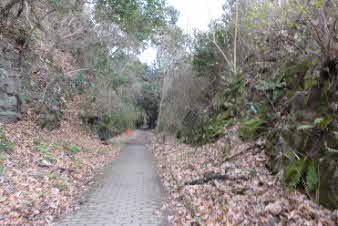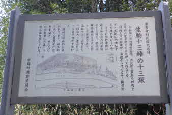 | トンネルを潜ると、左上が十三塚になっている。十三塚は、山の上に造られた塚で十三基あり、中央の七基目が「王塚」と呼ばれ、直径6m、高さ1mで、一番高いところに「十三塚標石」が建っている。この標石は、1850年に建てられたそうだ。 十三塚は、全国に300ヶ所以上あるそうで、古墳のように文化財として残されることが少なく、開発によって姿を消しつつあるようだ。ちなみに、生駒十三峠の十三塚は、国の重要有形民俗文化財になっているようだ。 |
