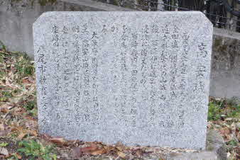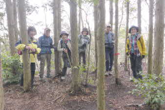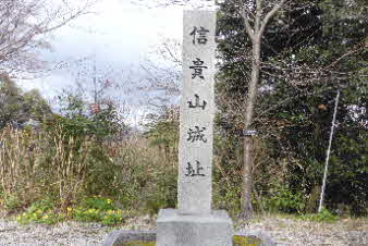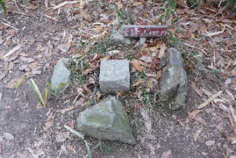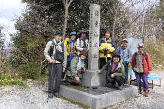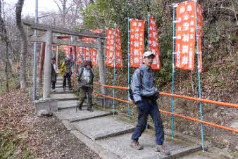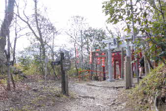 | 信貴山山頂をあとに、下り始める。赤い鳥居の並びにあった、信貴山城址碑の前で記念写真を撮って、赤い旗の道を下っていった。 雌岳の分岐まで下り、雌岳へ登り返した。雌岳の標高は400mだ。山頂は木だけで他の何もなく薄暗いだけだ。雄岳の山頂は赤い旗でにぎやかなのに。 |